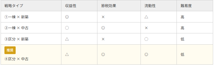 実需用不動産の中でも、物件の形態(一棟or区分)と築年数(新築or中古)の組み合わせにより、その成果は劇的に変わります。
